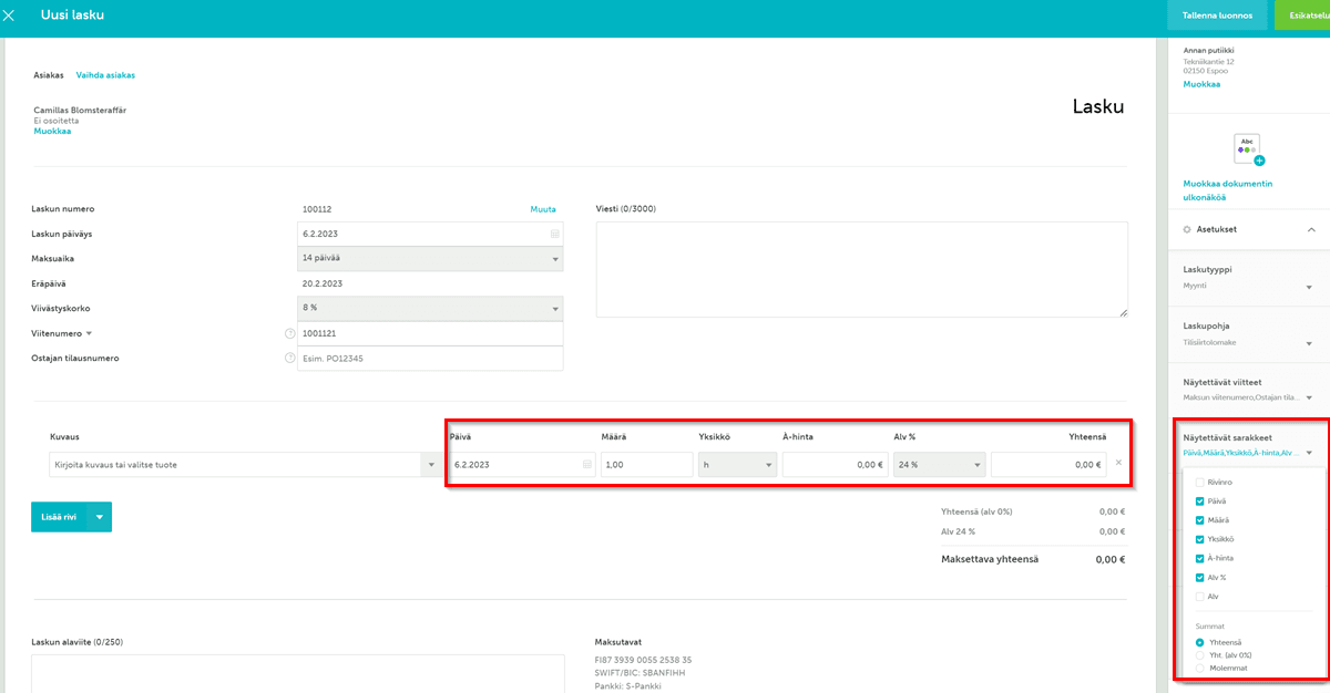 Huomaa, että sarakkeiden nimiä (Päivä, Yksikkö jne.) ei voi muuttaa. Laskun lopussa olevaa arvonlisäverollista tai -verotonta summaa ei ole mahdollista piilottaa.