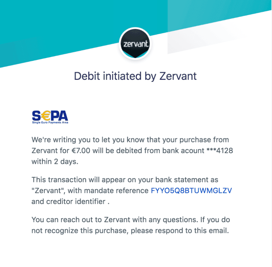 Now that your payment is processed, you will receive an email from Stripe each time your monthly subscription is debited from your bank account via SEPA Direct Debit: