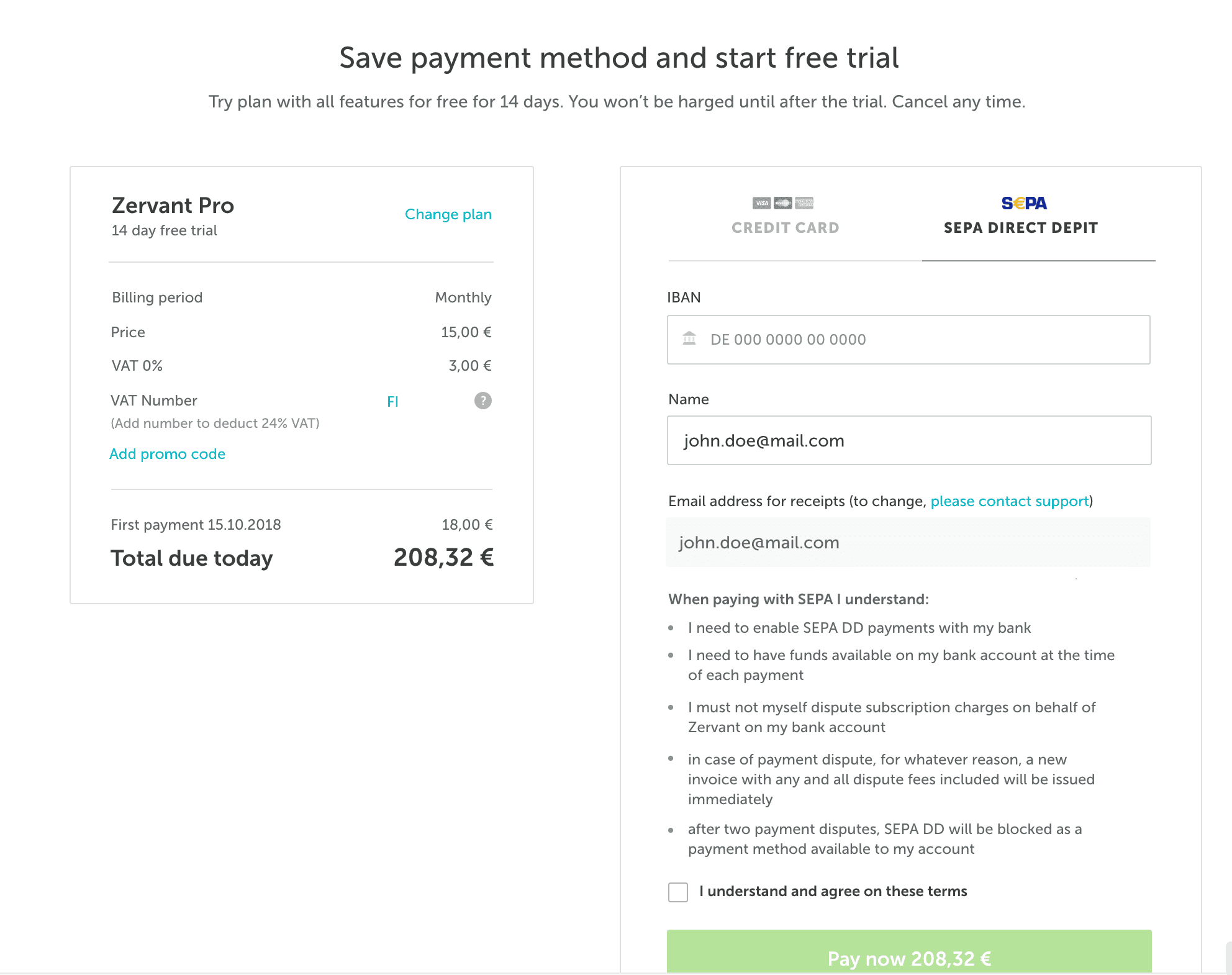 When prompted to set up payment for your Zervant subscription, you will see this option: