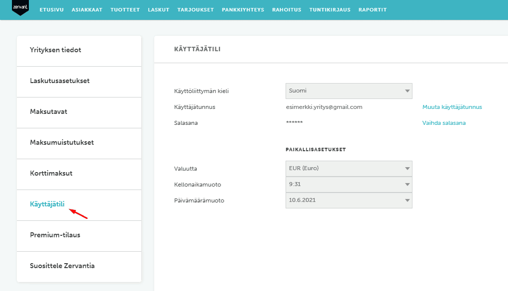 Pääset määrittämään Zervant-käyttäjätilisi seuraamalla polkua Oma tili -> Käyttäjätili.