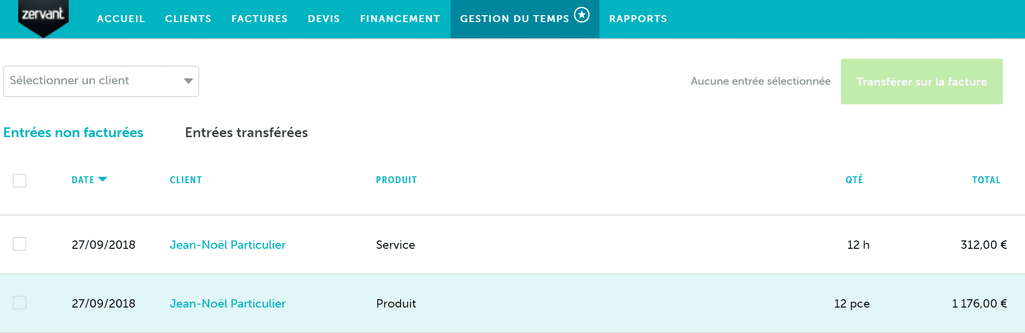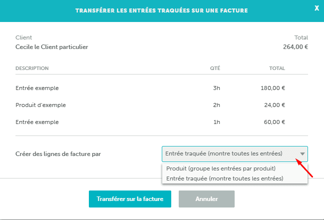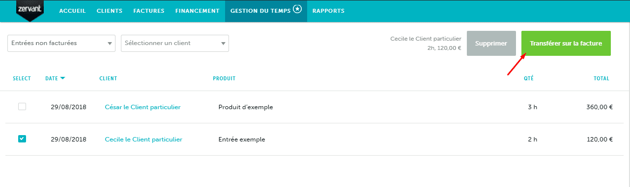 Veuillez noter que vous ne pouvez facturer qu'un client à la fois. Si vous sélectionnez plusieurs entrées pour clients différents, vous ne pourrez pas cliquer sur Transférer sur la facture.